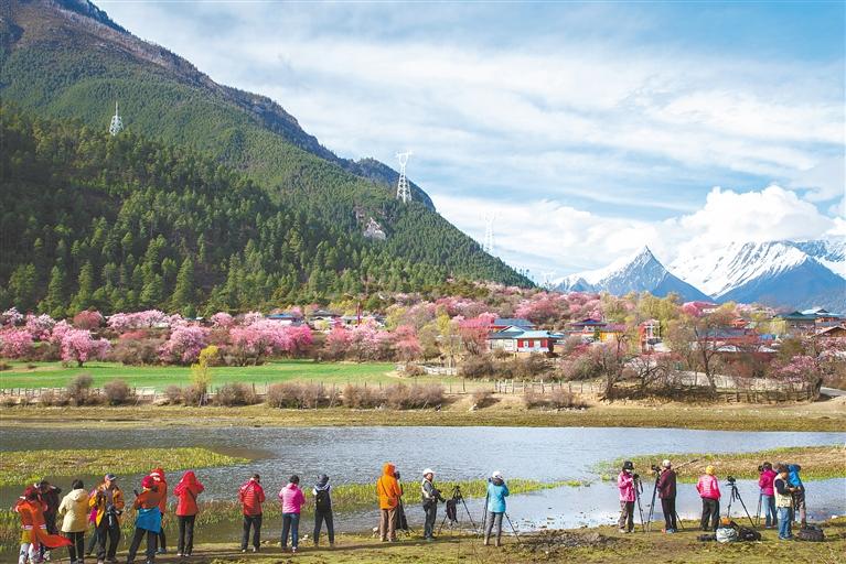 旅游業快速發展,全區旅游接待人數和旅游總收入分別由2012年的1058萬人、126.47億元增加至2021年的4153萬人、441.90億元。圖為2021年4月西藏自治區林芝市桃花節迎來國內外游客。