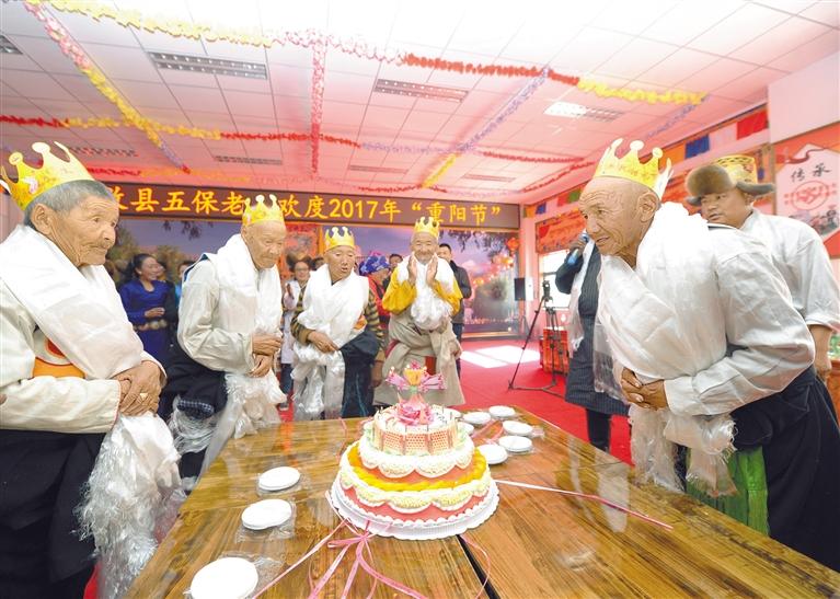 社會保障兜底一批。2021年,農村居民最低生活保障標準達到5060元/年/人,城鎮居民最低生活保障標準達到10920元/年/人。圖為2017年10月28日,西藏自治區拉薩市達孜區特困人員集中供養服務中心為80歲老人們集體過生日。