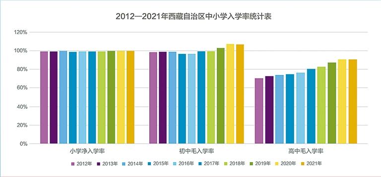 教育事業成果豐碩。全區共有各級各類學校3339所,在校學生92萬人。圖為西藏自治區中小學入學率統計表。