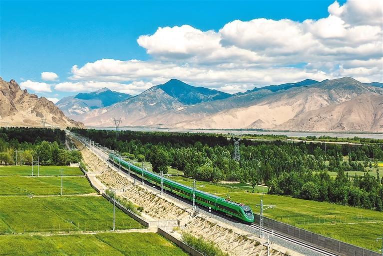中央支持西藏自治區基本建成涵蓋公路、鐵路、航空、管道等多種運輸方式的綜合立體交通網絡。2021年6月25日,川藏鐵路拉林段正式開通運營。圖為開通當日,復興號高原內電雙源動車組首次開上青藏高原。