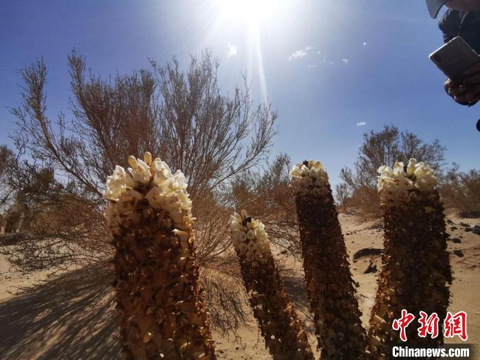2020年5月16日,甘肅酒泉市金塔縣境內沙漠里,梭梭林下的肉蓯蓉花開。 殷春永 攝