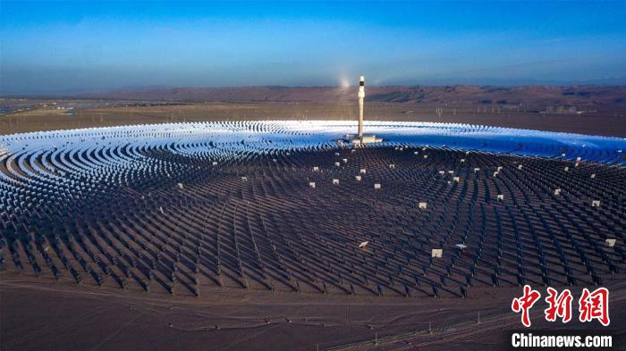 圖為10月16日,甘肅省敦煌市光電產業園區內,萬余面定日鏡以同心圓狀圍繞著260米高的吸熱塔。 王斌銀 攝