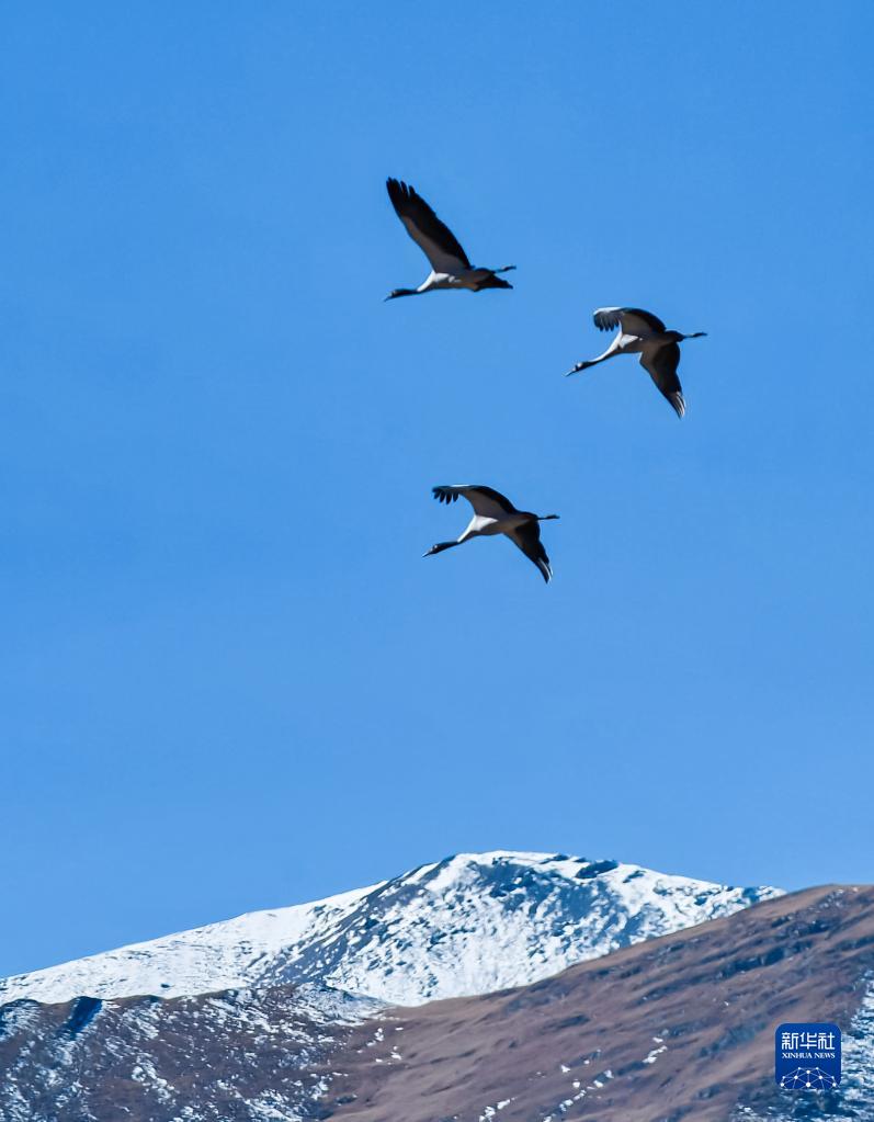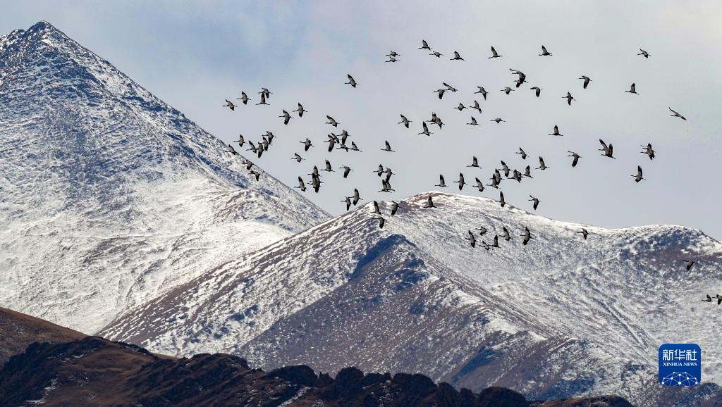黑頸鶴群飛過林周縣強嘎鄉境內山梁(11月6日攝)。新華社記者 姜帆 攝