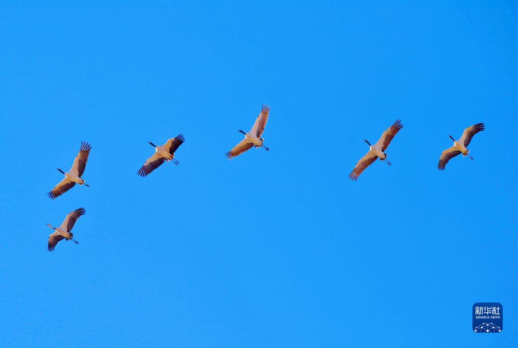 黑頸鶴在林周縣黑頸鶴自然保護區上空盤旋(11月6日攝)。新華社記者 張汝鋒 攝