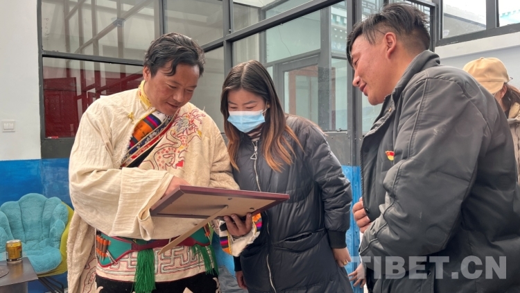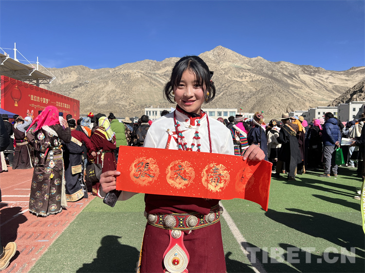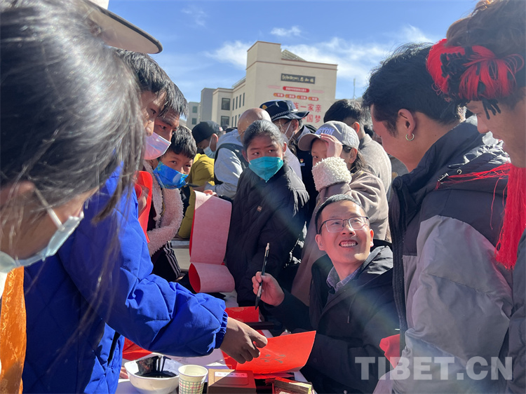 來到送“書法”現場,書法家們早早地來到活動現場,他們準備筆墨、鋪開紙張,為現場群眾書寫藏、漢文新年對聯,“福”字、“吉祥如意”、“扎西德勒”等寓意美好的祝福。書法家協會副主席祖牛拉巴次仁說:“從春節開始,我們書法家們去學校、社區、搬遷安置點等地,書寫了超過1萬件的書法作品。這些作品深受大家的喜愛,我們后續也會繼續開展送‘書法’公益活動”?,F場群眾聚集在送“書法”現場,“西熱措姆”“張文青”“索朗旺青”“朗嘎達瓦”……孩子們爭先恐后請書法家把自己的名字寫在紅紙上?!斑@是我的名字,我爸是西寧人,我媽是那曲的,我們是從那曲安多縣搬遷過來的,我現在在森布日幸福中學上初三,將來要考那曲高級中學”張文青拿著書家贈給她的“名字”用流利的那曲話對記者說。