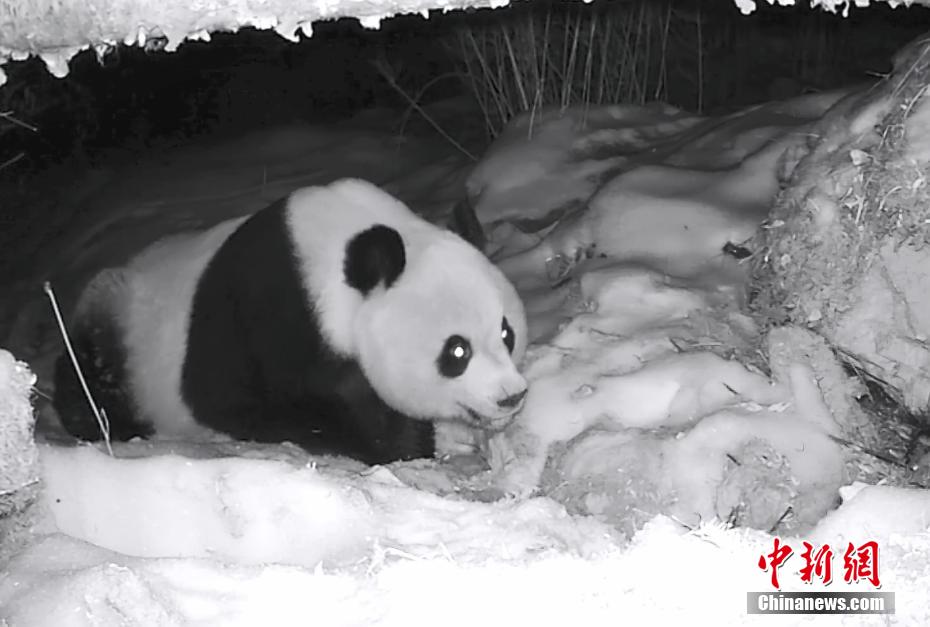 近日,大熊貓國家公園四川平武王朗片區工作人員在回收野外紅外線相機時,發現幾段野生大熊貓在雪地中找水喝的珍貴影像。圖為野生大熊貓在雪地中找水喝。