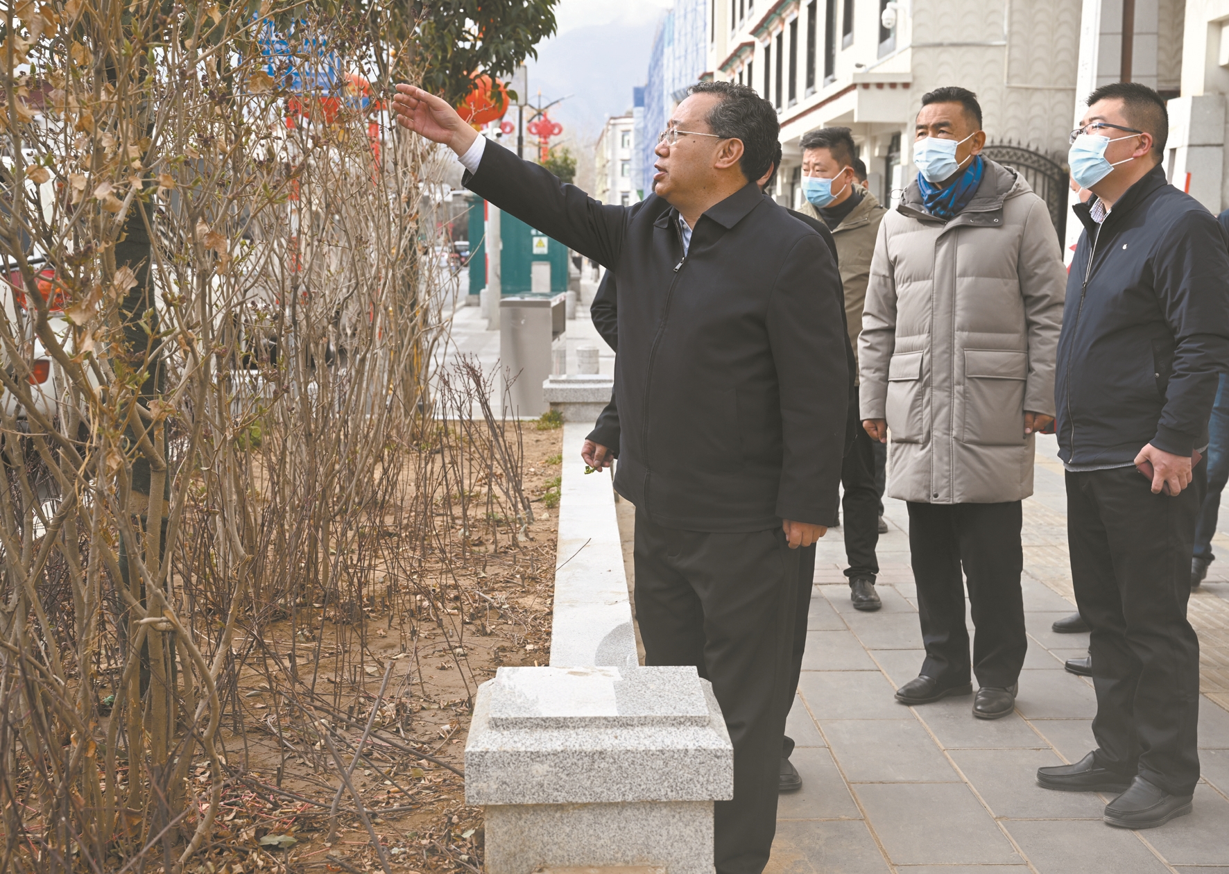 3月15日,西藏自治區黨委常委、市委書記普布頓珠帶隊深入城關區,調研城市建設管理工作。圖為普布頓珠在朵森格路中段調研道路兩旁綠化帶植物缺損問題。拉薩融媒記者 巴桑次仁攝