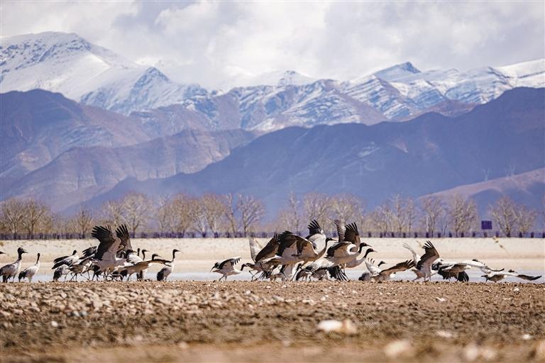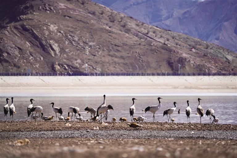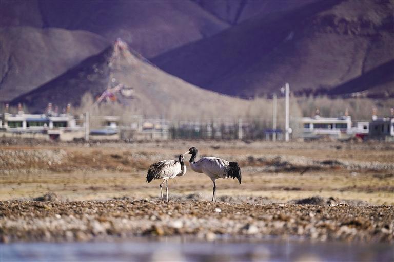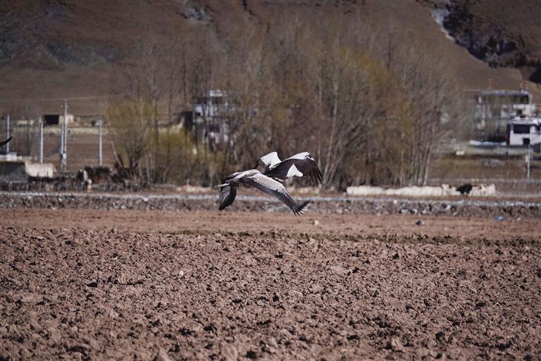 黑頸鶴是國家一級保護動物,在藏語中稱為“沖沖”。主要棲息在海拔2500米至5000米的高原、草甸、沼澤地帶。拉薩北部的林周縣平均海拔約4200米,是黑頸鶴的主要越冬地之一。最近這段時間,對拉薩市林周縣野保員們來說,一邊要忙自家的農活,一邊還要巡查候鳥情況。“已經有一小部分飛走了,估計再過半個月都會陸續飛走。”3月23日上午,野保員旦增告訴記者,在虎頭山水庫和卡孜水庫越冬的候鳥有一部分已經飛走了。野保員口中的“飛走”便是遷徙,遷徙是候鳥的本能,一年一年,跟隨時間的召喚,完成兩次遷徙:繁殖和越冬。