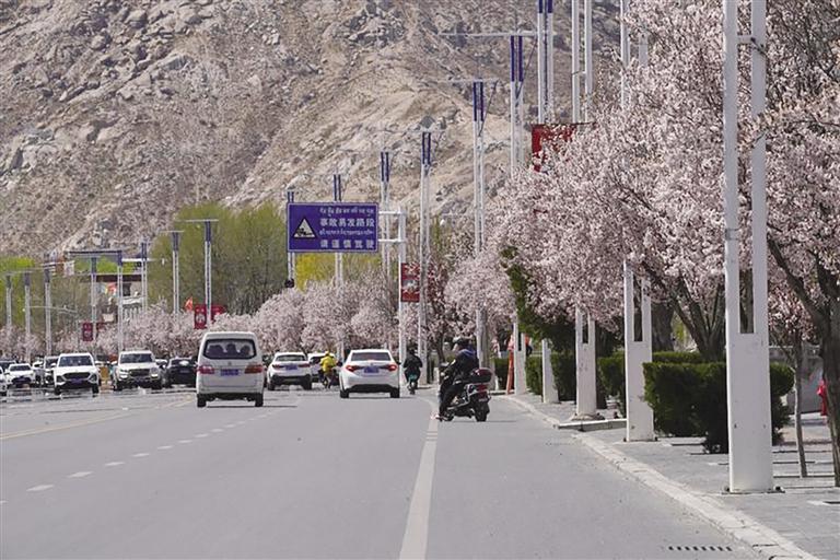 那么,去哪里查收這份“春日限定大禮包”呢?最近幾天,記者的朋友圈都被帕崩崗的美景霸屏了,一波又一波的朋友到這里打卡。除了去帕崩崗賞桃花,更不容錯過的一定是拉薩大街小巷以及公園中驚鴻一瞥的美景。宗角祿康公園植被繁茂、古樹較多,一到春季,玫粉色的榆葉梅綻放枝頭,層層花瓣在陽光的照耀下嬌俏動人,一樹粉色花朵倒映在幽綠的湖水中,盡顯詩意。此外,緊鄰羅布林卡的羅堆東路也有意想不到的美景,每到這個季節,紅葉李便會沿路盛開,淡粉色的花瓣搭配深紅色的花蕊,甚是好看。金珠西路沿途的景色也令人耳目一新,淡粉色的花朵肆意綻放,等紅燈時的心情因這些花朵變得不再焦灼。