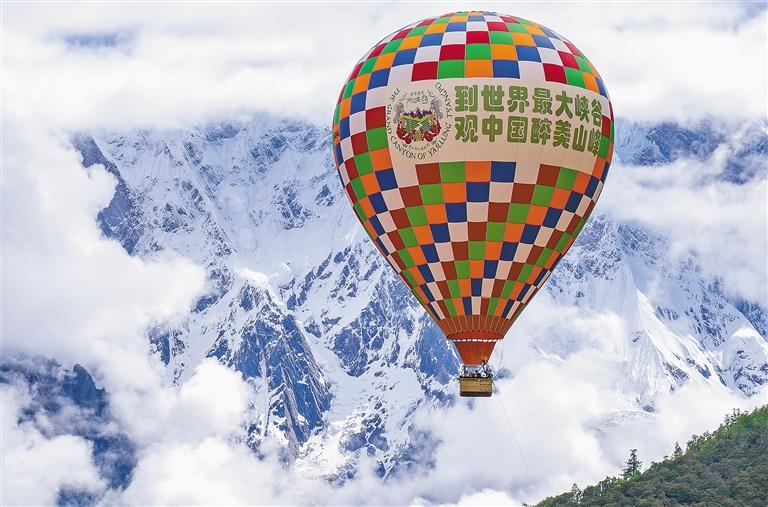 游客在米林市派鎮乘坐熱氣球俯覽雅魯藏布大峽谷。