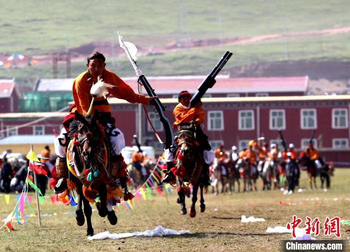 資料圖為玉樹州雜多縣瀾滄江源生態文化旅游系列活動開幕式上的馬術表演。薛蒂 攝