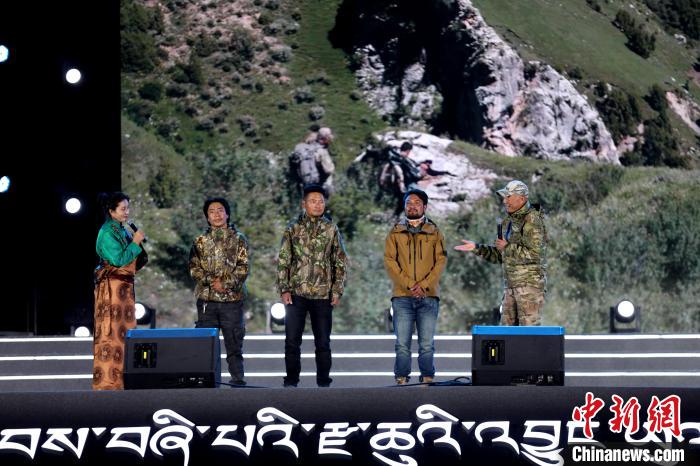 資料圖為紀錄片《雪豹和她的朋友們》導演奚志農(右一)在雜多縣分享創作背后的故事。薛蒂 攝