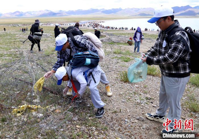 圖為青少年在納木錯湖畔撿拾垃圾。拉薩市圖書館供圖