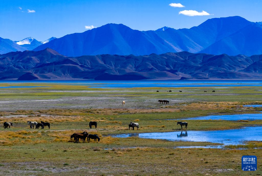牧民在班公湖畔放牧(無人機照片,9月21日攝)。新華社記者 姜帆 攝
