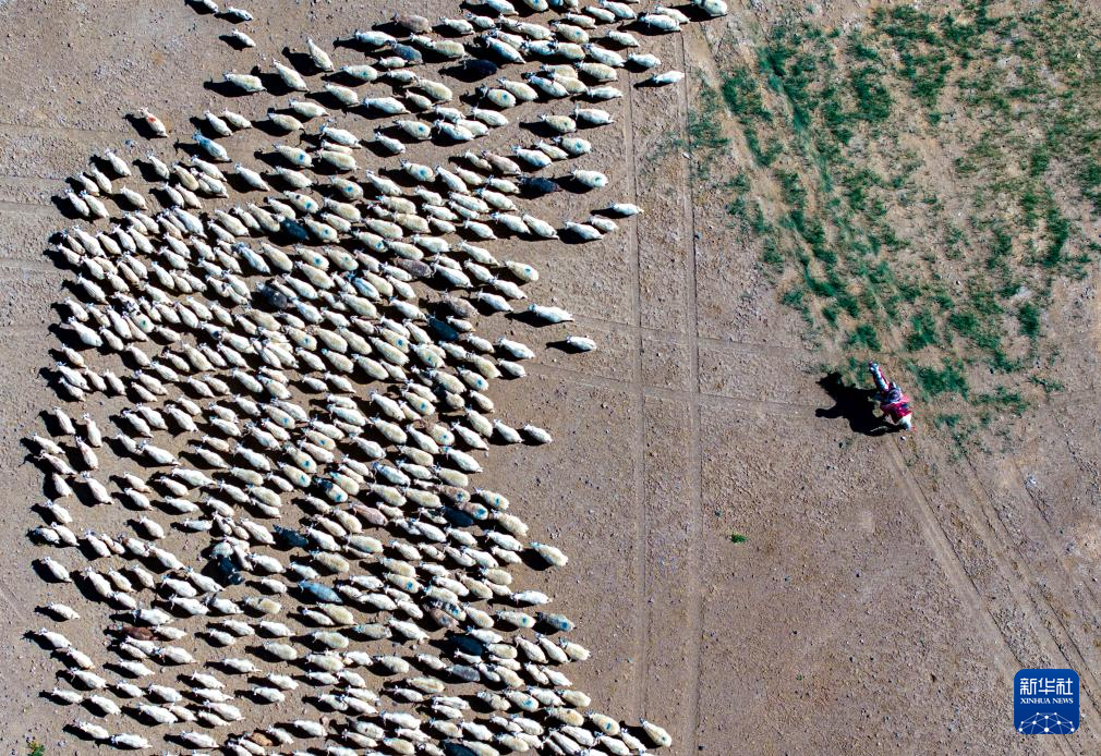 牧民在阿里地區日土縣班公湖畔放牧白絨山羊(無人機照片,9月21日攝)。新華社記者 姜帆 攝