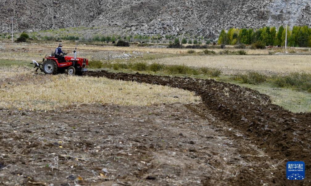 西藏拉薩市達孜區德慶鎮白納村村民駕駛小型拖拉機犁地(10月11日攝)。新華社記者 張汝鋒 攝
