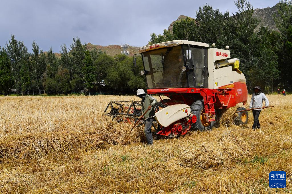 工作人員駕駛農業機械在西藏拉薩市林周縣曲果強村的高標準農田里收獲小麥(10月12日攝)。新華社記者 張汝鋒 攝