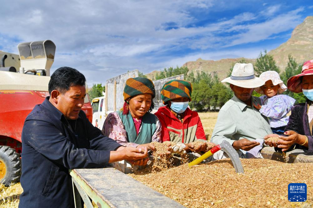 西藏曲水縣才納鄉白堆村村民在高標準化農田內收獲青稞(9月11日攝)。新華社記者 張汝鋒 攝