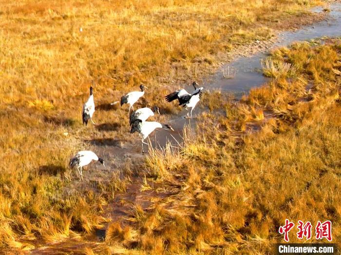 金秋十月,位于青海湖北岸的草原一片金黃。攝影愛好者在青海省海北藏族自治州剛察縣吉爾孟鄉日格加柔地區,拍攝到六只黑頸鶴在這里“安家落戶”,它們或擠在一起沐浴秋日的暖陽,或三五成群覓食嬉戲、閑庭信步,為草原增添了一份靈動與生機。黑頸鶴被稱為“高原仙子”“鳥類大熊貓”,是全球十五種鶴類中唯一在高原繁殖和棲息的鶴類。