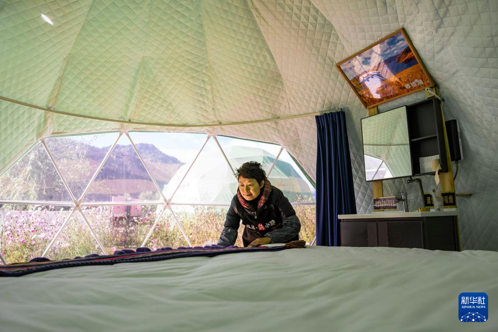 工作人員在西藏芒康縣如美鎮拉烏村一座星空帳篷內收拾床鋪(10月20日攝)。新華社記者 孫非 攝