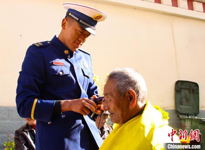 圖為林芝市森林消防支隊波密中隊消防員正在為老人理發。馮怡凡 攝