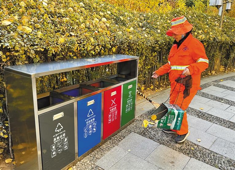 圖為環衛工人在按照分類投放垃圾。記者 王敏 攝