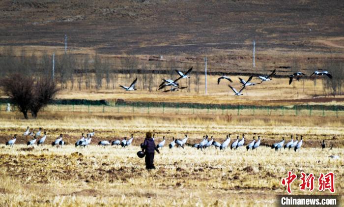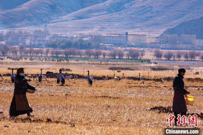 圖為拉薩林周縣境內的村民給黑頸鶴投食。扎頓 攝