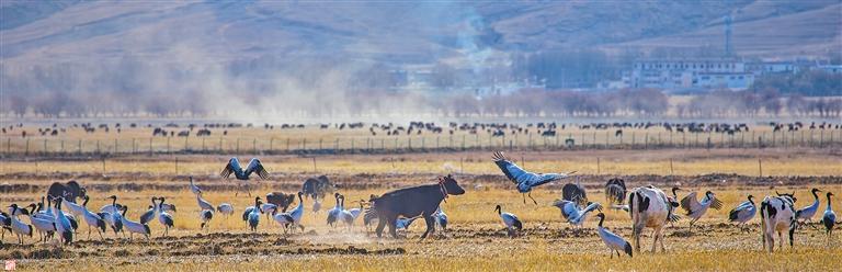 卡孜濕地是其中一個投食點。現年43歲的洛桑次旦就住在附近,每天一大早,他都會到卡孜濕地放牧。“‘鄰居’越來越多了,十幾年的時間,黑頸鶴的數量從幾只增長到幾百只。”洛桑次旦告訴記者,黑頸鶴和牛各吃各的,互不干擾,非常和諧。