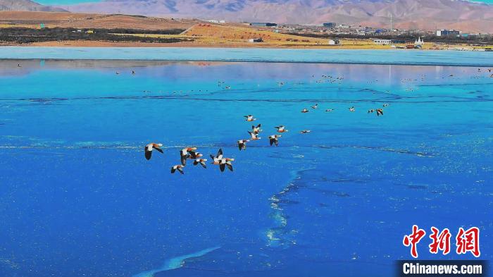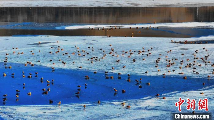 高原冬日,在位于青海湖北岸的青海省海北藏族自治州海晏縣境內,成群的赤麻鴨、綠頭鴨等鳥類現身青海省東大灘水庫,它們時而“泡湯”洗浴,時而振翅高飛,時而覓食嬉戲,展現出一幅冬日和諧的美好畫面。近年來,越來越多鳥類來到青海湖北岸覓食休憩,此時一半冰層一半碧波的東大灘水庫成了鳥類覓食的好去處。