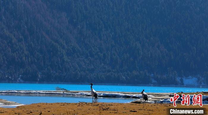 西藏林芝巴松措景區(qū)迎“高原精靈”黑頸鶴越冬