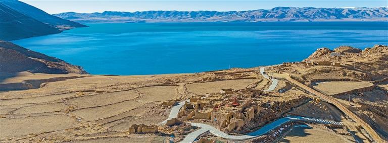 在當惹雍錯湖畔,尼瑪縣甲谷鄉吉松村剛剛竣工的棧道和觀景臺(無人機照片)。新華社記者 格桑朗杰 攝