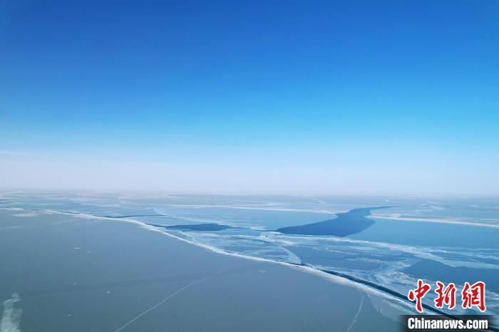 圖為航拍青海湖冰面裂縫。薛蒂攝