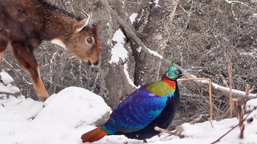 近日,“新春走基層”記者在中國與不丹交界的西藏洛扎縣拉康鎮,拍到了喜馬拉雅斑羚和棕尾虹雉兩種珍稀野生動物同框的畫面。喜馬拉雅斑羚和棕尾虹雉均是國家一級保護動物。