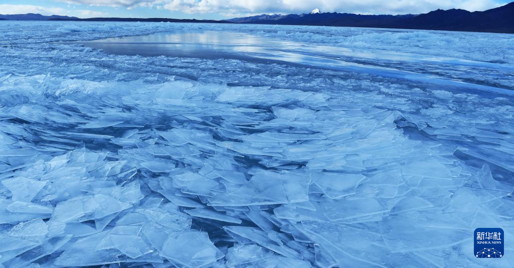 冬日里,瑪旁雍錯部分湖面已經結冰,形狀各異的浮冰漂在水面上,在深綠色湖水的映襯下,構成了一道獨特的風景線。