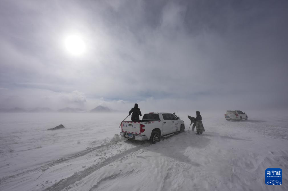 瑪曲鄉長江源黨員環保志愿隊巡邏途中車輛陷入雪中后進行自救(2024年2月2日攝)。新華社記者 晉美多吉 攝