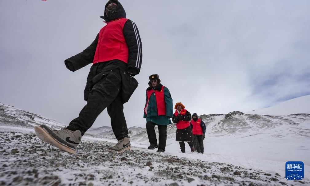 瑪曲鄉長江源黨員環保志愿隊年近七旬的才嘎老人(右二)在巡邏守護長江源(2024年2月2日攝)。新華社記者 晉美多吉 攝
