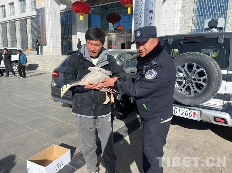 圖為曲奴鄉(xiāng)思布村村民扎頓將受傷的“斑頭雁”交給派出所民警。