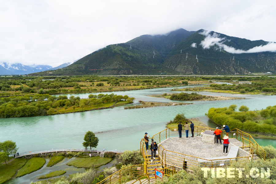 資料圖:游客在雅尼國家濕地公園的觀景臺(tái)上觀賞高原壯麗風(fēng)光