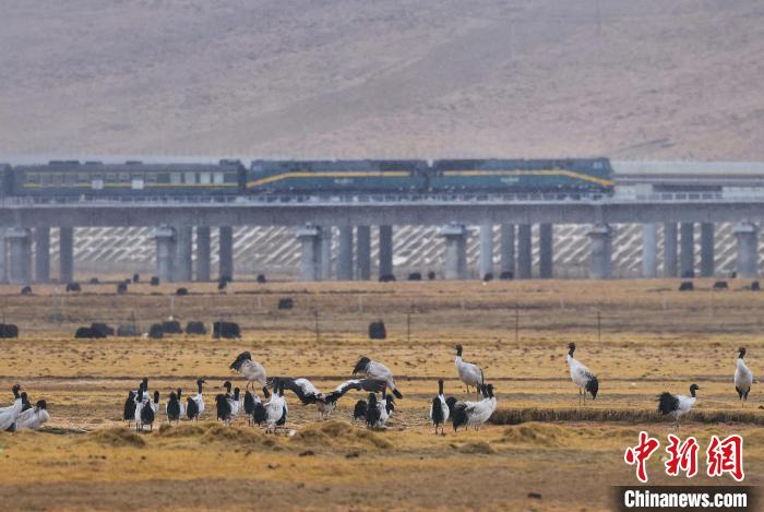 遠處,有火車沿著青藏鐵路鳴笛經過,黑頸鶴們“淡定一瞥”,仿若未聞其聲,繼續欣賞水中的倒影,于鳥鳴處處,水聲悠悠間自得其樂。