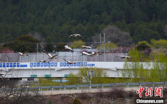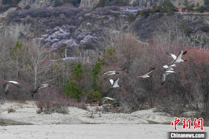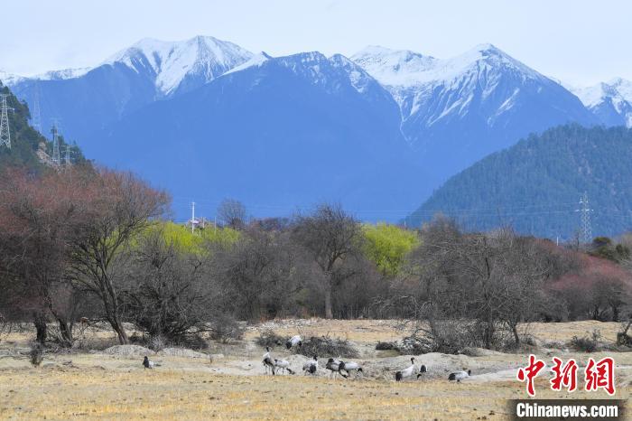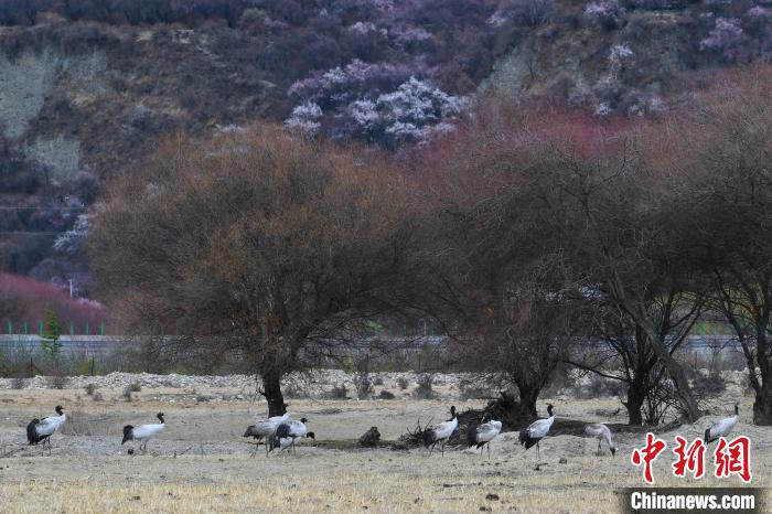 西藏林芝:黑頸鶴與雪山桃花共繪生態畫卷