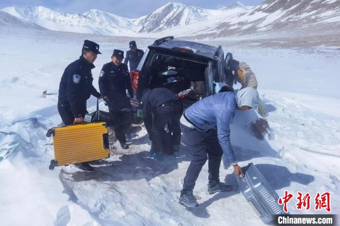 警車出發后行駛約1個小時抵達救援現場附近,由于道路積雪,事發地海拔超過5300多米,車輛無法繼續前行,民警徒步到達現場,先用便攜式氧氣瓶給高反嚴重的游客供氧。隨后民警對現場進行察看,發現車輛深陷積雪中,靠人力已無法脫困,決定先將被困人員及車上貴重物品帶回。