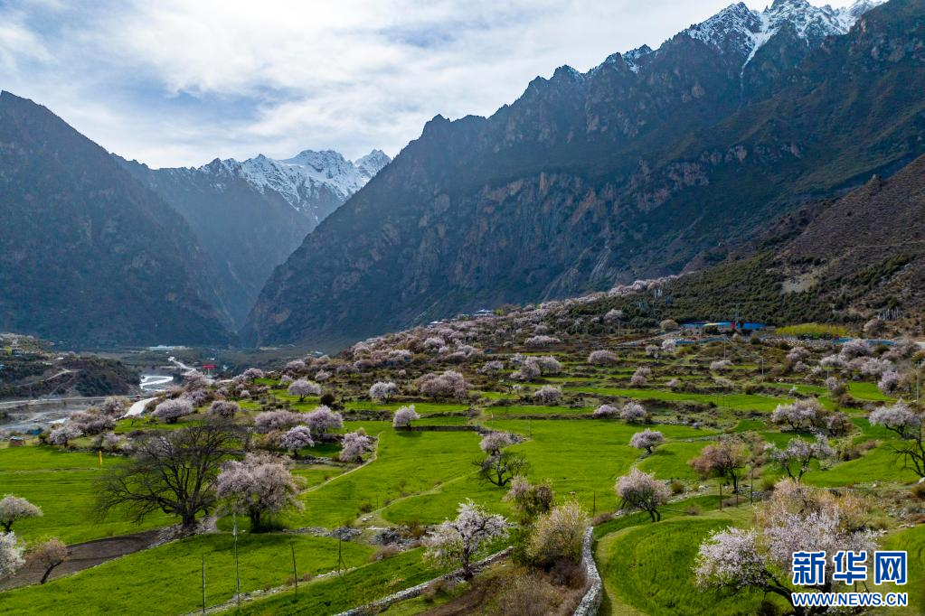 4月18日,在嘉黎縣尼屋鄉扎西崗村盛開的桃花(無人機照片)。新華網 旦增努布 攝