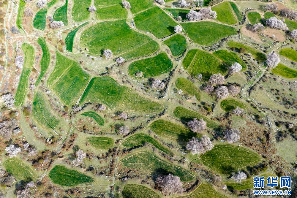4月18日,在嘉黎縣尼屋鄉境內田間盛開的桃花(無人機照片)。新華網 旦增努布 攝