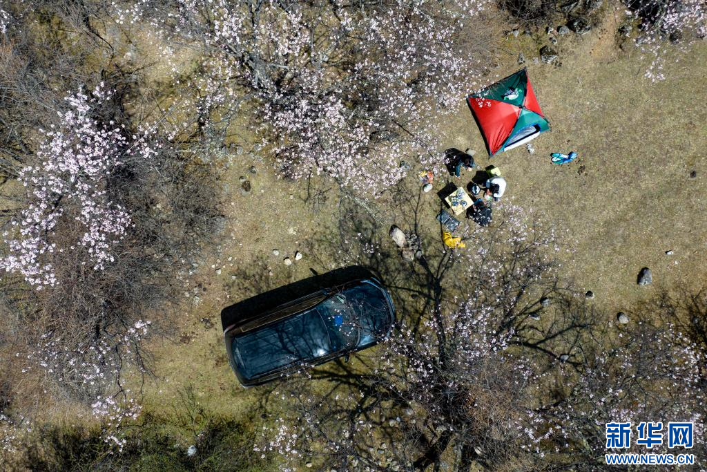 4月18日,群眾在嘉黎縣尼屋鄉境內桃花間“過林卡”(無人機照片)。新華網 旦增努布 攝