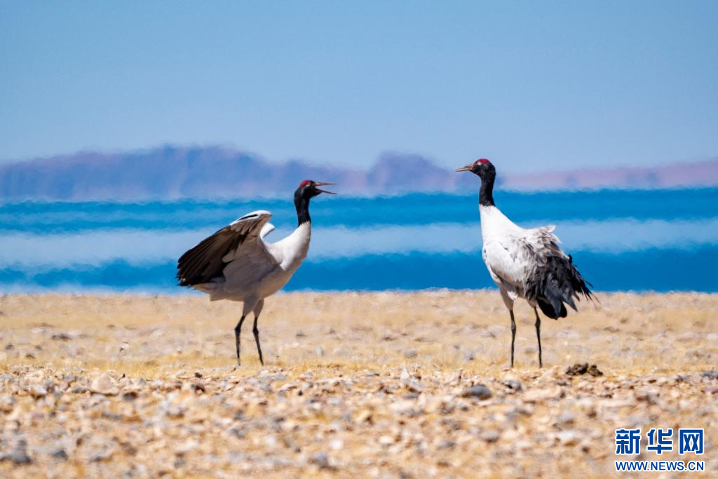 4月14日,在色林錯國家級自然保護區拍攝的黑頸鶴。新華網 旦增努布 攝