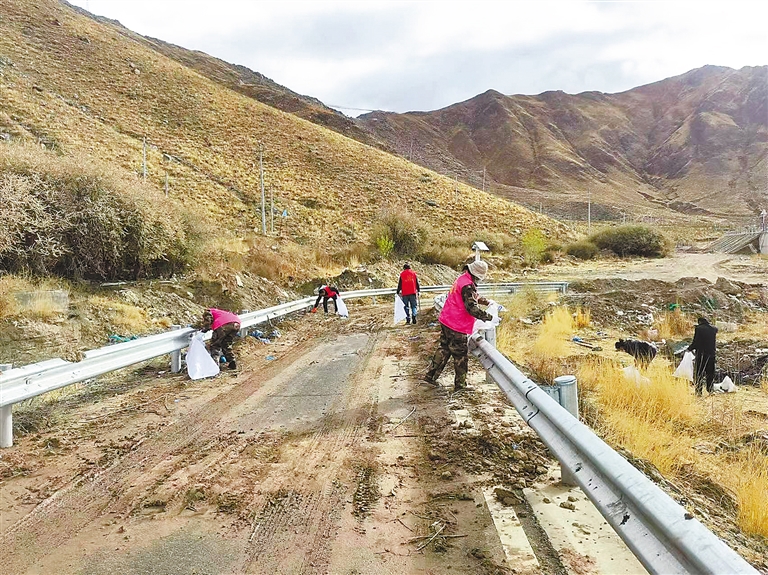 圖為志愿者對嘎巴村公路沿線和空地的白色垃圾、飲料瓶及塑料袋等進行清理。記者 格桑倫珠 攝