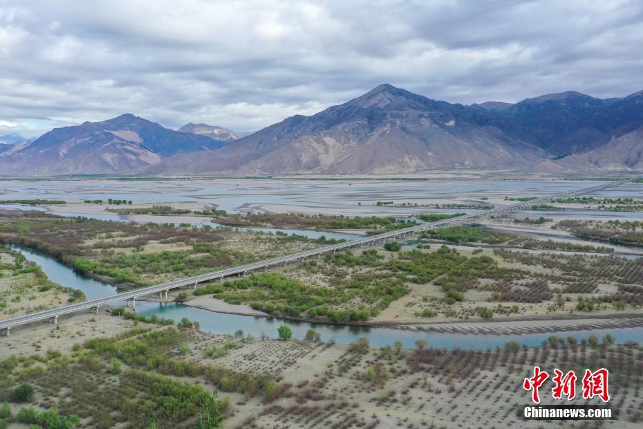 5月23日,西藏山南市扎囊縣境內的雅魯藏布江沿岸綠樹成蔭。在雅魯藏布江中游沿岸,頑強生長著柳樹、北京楊、銀白楊、刺槐、油松、樟子松等植物。圖為西藏山南市境內的雅魯藏布江沿岸一角。(無人機照片)