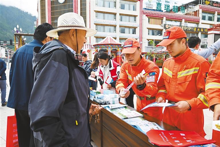 活動現場,波密縣森林消防中隊消防員通過發放防災減災宣傳資料、講解安全生產常識的形式,向過往群眾宣傳普及森林火災、洪澇、山體滑坡、地震等自然災害以及逃生自救、互救知識和技能。