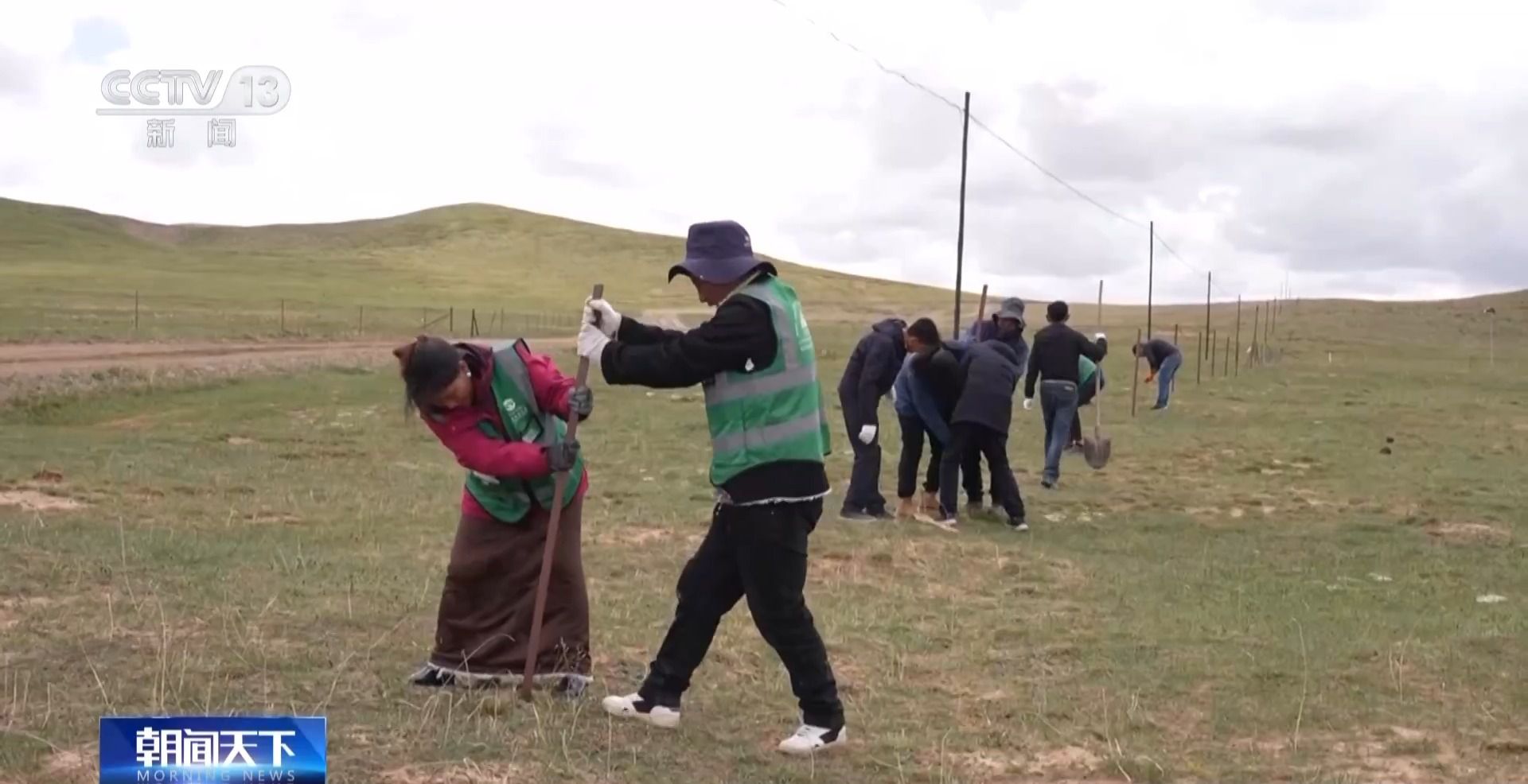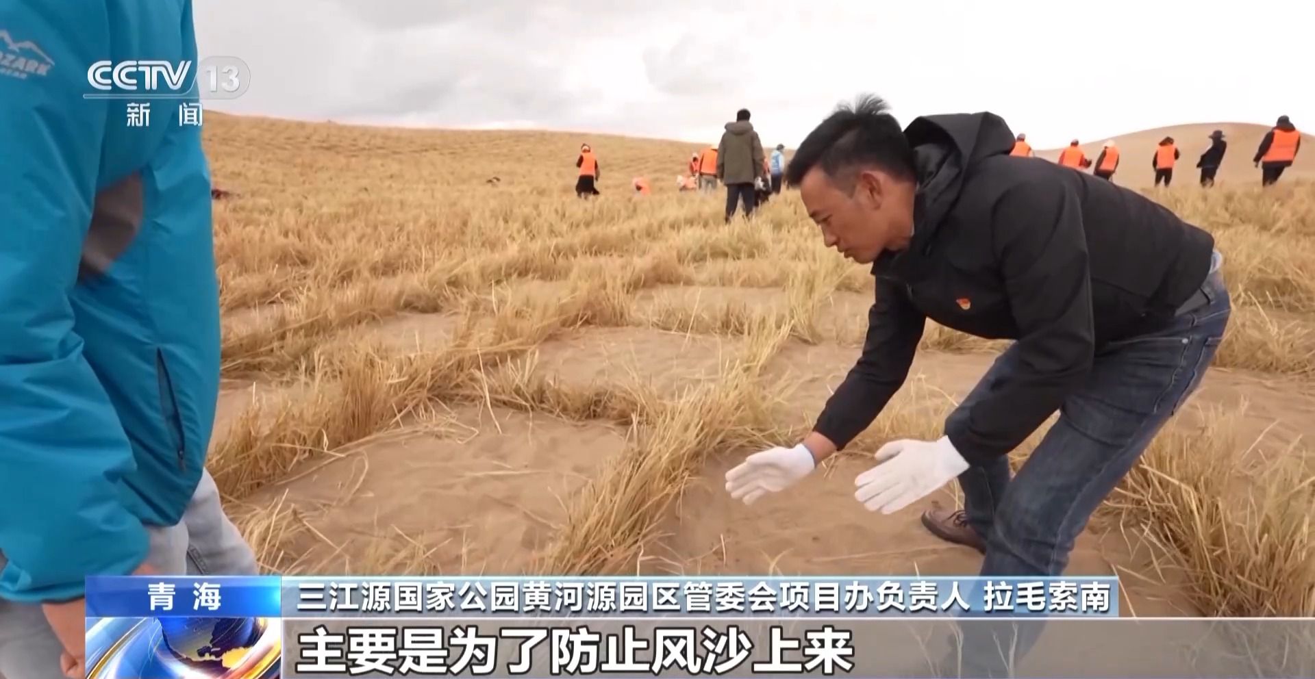 三江源國家公園黃河源園區管委會項目辦負責人 拉毛索南:草方格整體打好以后,把草籽灑在這些中間里面,它就主要是為了防止風沙上來,把草籽埋得更深。