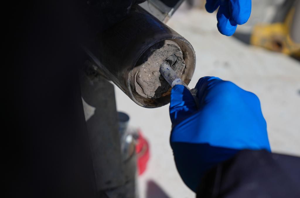 7月11日,鉆探工作人員正在取出鉆取的湖泊巖芯。新華社記者 晉美多吉 攝